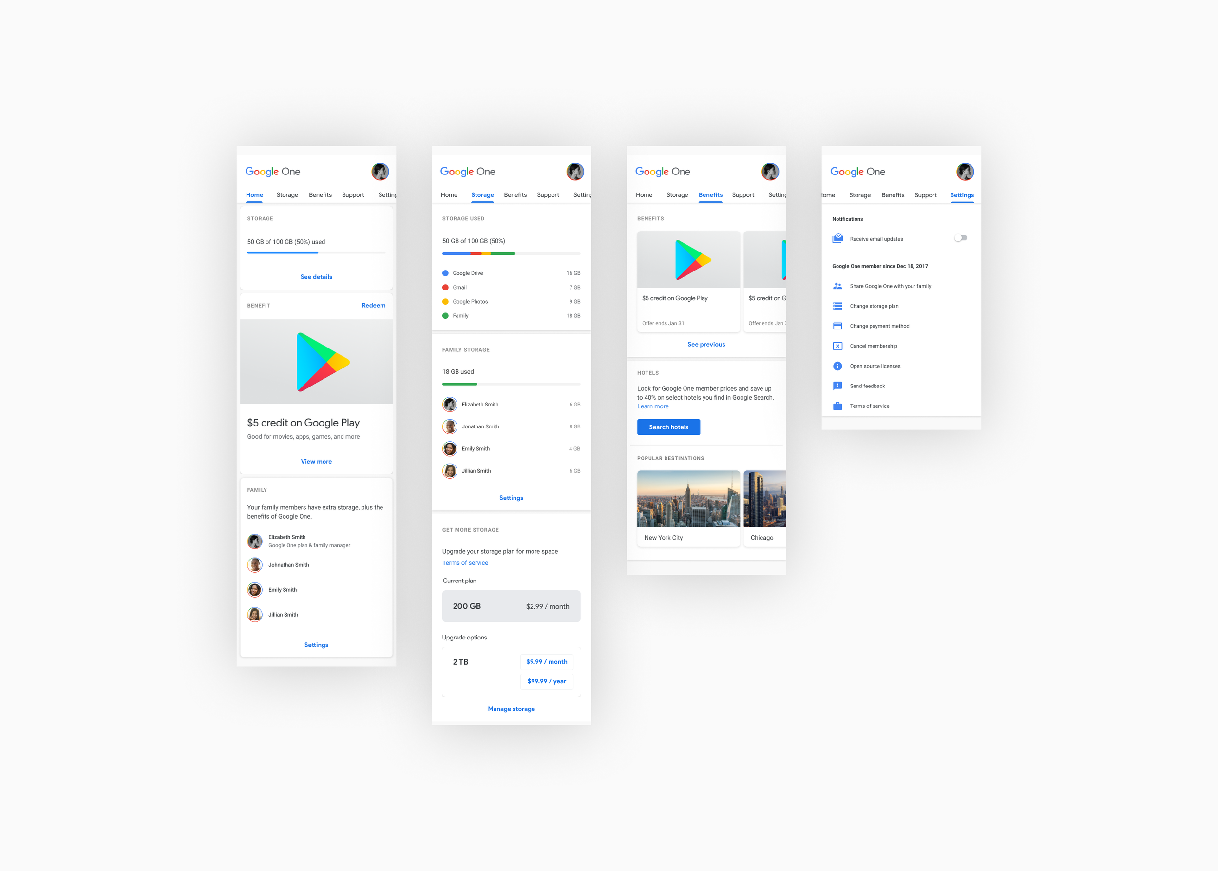 Google One evolved to being a bundle of benefits akin to Amazon Prime. But with all the many benefits, how is a user going to remember and conceive of this in their mind? Would they find any use in the idea of “many benefits”? Maybe not. So as interaction designer, part of my job would be conveying the primary purpose of this app to the user and making it simple, when it could be complicated enough that they could easily ignore it as well. As our product concept evolved, so did the possible compelling uses of the Android app. Users could now use the app to check how much storage they were using, sign up for more storage, manage their subscription, backup or restore their phone, redeem rewards, or get discounts on hotel bookings. Just one of these, redeeming rewards, warranted checking in to this app occasionally or receive notifications to get these deals. These benefits all utilized properties across Google, so it became easier for us to work with other teams as we in a sense promoted their products.